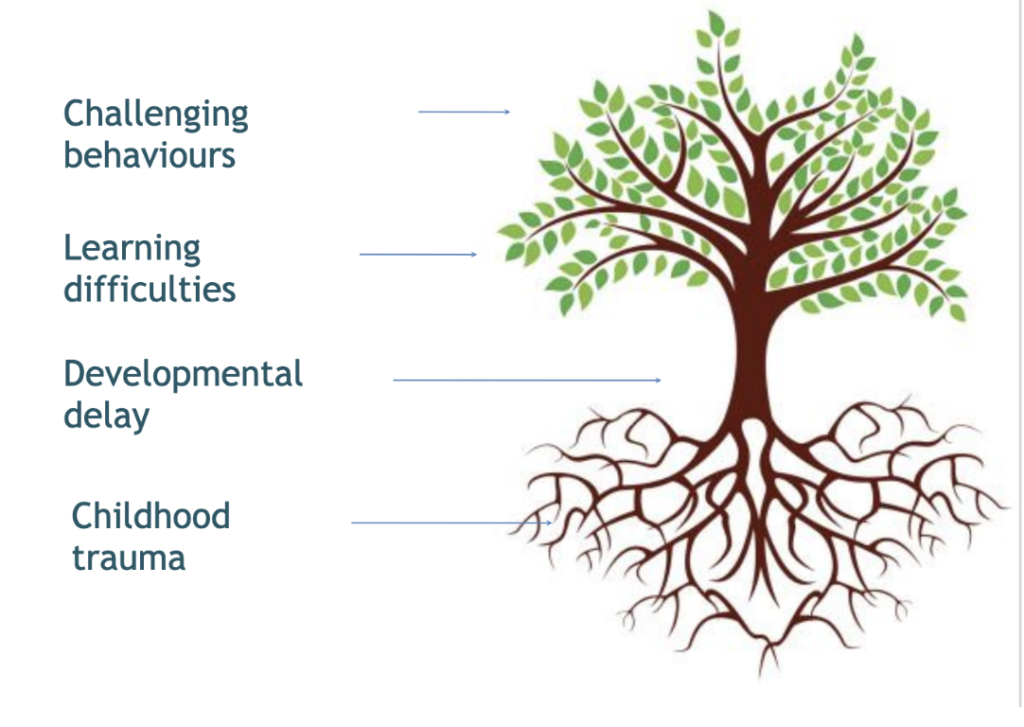 What we notice is the top of the tree, the behaviours, such as anxiety, meltdowns, aggression, abuse, daydreaming, restlessness, impulsivity, frustration, inability to focus, excessive fidgeting, poor social development, motor skills, learning difficulties.